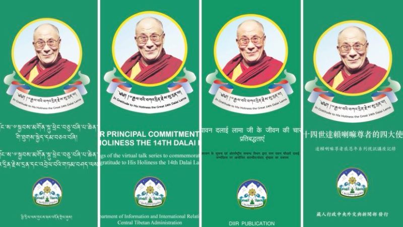 དེ་ཡང་། བོད་མིའི་སྒྲིག་འཛུགས་ཀྱིས་འདི་ལོའི་ཕྱི་ཟླ་༧ ཚེས་ ༦ ཉིན་སྤྱི་ནོར་༸གོང་ས་༸སྐྱབས་མགོན་ཆེན་པོ་མཆོག་ཕྱི་ལུགས་ལྟར་དགུང་གྲངས་ ༩༠ ལ་ཕེབས་པའི་༸སྐུའི་གོ་སྟོན་དང་བསྟུན། ལོ་གཅིག་གི་རིང་བྱམས་བརྩེའི་ལོ་ཞེས་སྲུང་བརྩི་ཞུ་གཏན་ཁེལ་བ་འདིའི་ཆ་ཤས་སུ་༸རྒྱལ་བའི་ཐུགས་བསྐྱེད་དམ་བཞིའི་སྐོར་སྐད་ཡིག་བཞིའི་ནང་ཡོད་པའི་འཕྲུལ་དེབ་འགྲེམས་སྤེལ་གནང་སོང་།